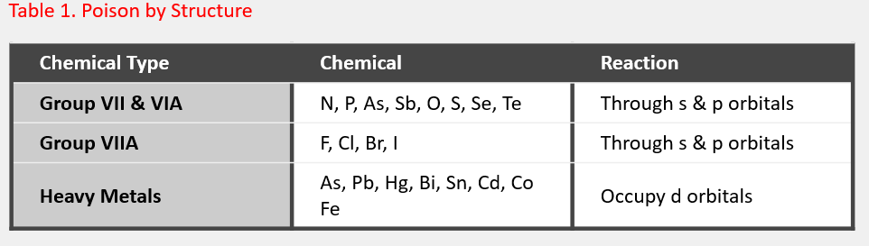 Tables 1 and 2 below provide a selection of catalyst poisons by structure and catalyst type.